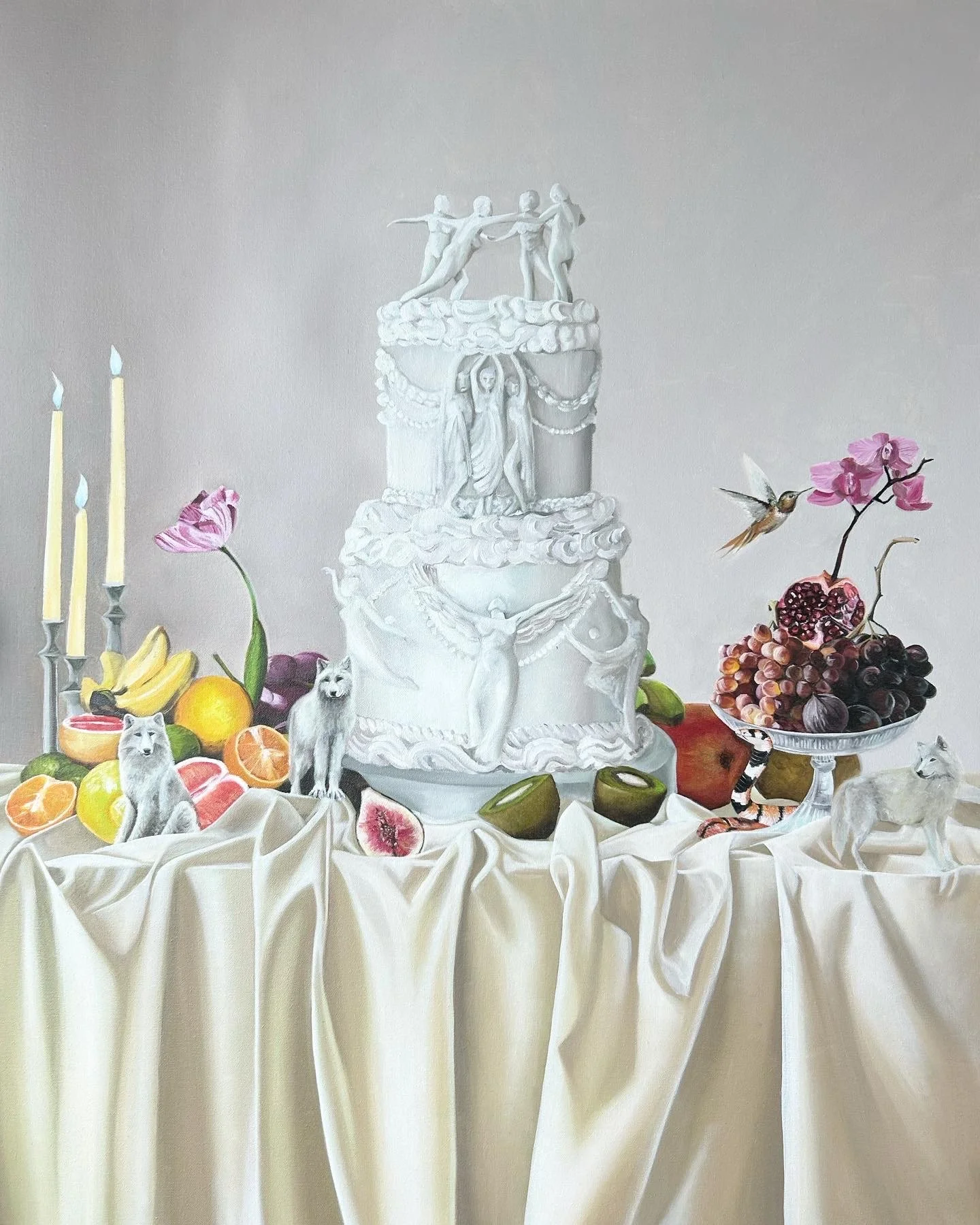 This still life series depicts carefully composed arrangements of food and domestic objects in which animals and symbolic figures are integrated into the image. These elements are intentionally placed to blend with the composition, remaining partially concealed within the forms, textures, or colors of the scene. The works draw from both personal references and shared cultural imagery, using concealment and visual ambiguity as strategies that require close observation and slow looking.